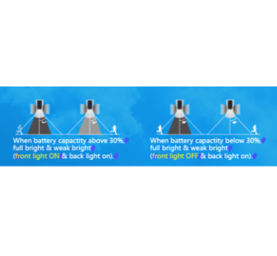 – Indien de lamp voor 30% is opgeladen door de zon brandt zowel de voorkant als achterkant zacht. Wanneer er beweging wordt gedetecteerd gaat de voorkant van de lamp op 100% branden.