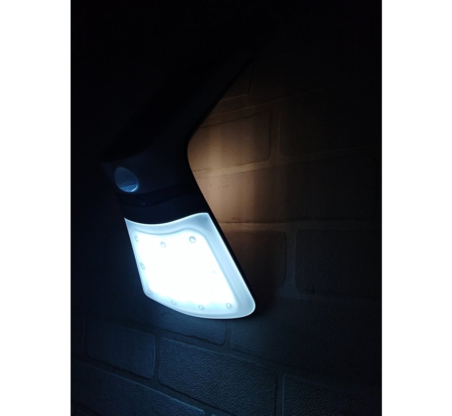 Zoals al werd uitgelegd, heeft deze solar muurlamp een bewegingssensor. De lamp gaat hierdoor in de avond aan op gedimd licht. Wanneer iemand langs de lamp loopt, wordt de lamp automatisch feller. Gemiddeld gaan onze solar lampen zo’n 35.000 branduren mee bij continu gebruik. Uiteraard draait de lamp alleen in de avonduren, waardoor de lamp een investering is voor de lange termijn. De lamp wordt standaard geleverd met bevestigingsset en wordt daarmee in een handomdraai in elkaar gezet. Het volledig opladen van de LED solar muurlamp duurt gemiddeld zo’n 8 uur. Overdag heeft de lamp genoeg tijd voor het opladen, waardoor je vervolgens lange tijd kunt genieten van deze buitenlamp. De lamp heeft aan de achterzijde 2 warm witte leds. De leds zorgen ervoor dat indirect licht aan beide zijden van de lamp wordt getoond. Dit noem men ook wel het butterfly-effect. Het licht blijft altijd branden en zichtbaar in het donker.